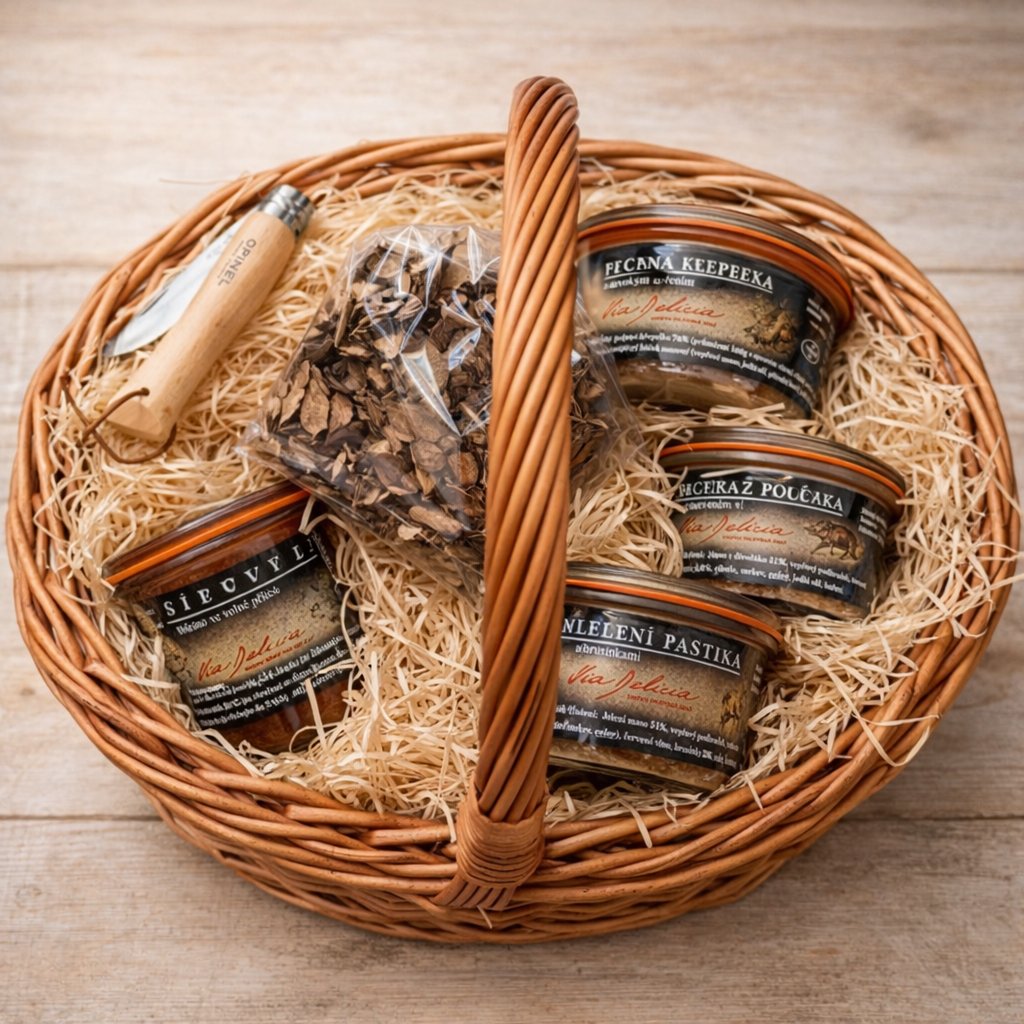 Paštika z divočáka (výrobce: Bezchlebova rodinná konzervárna, 130g): - paštika je provoněná divokým kořením a jalovcem, je dobře roztíratelná. Složení výrobku: Vepřové maso, maso z divočáka (31%), červené víno (4,5%), zelenina, sůl, koření