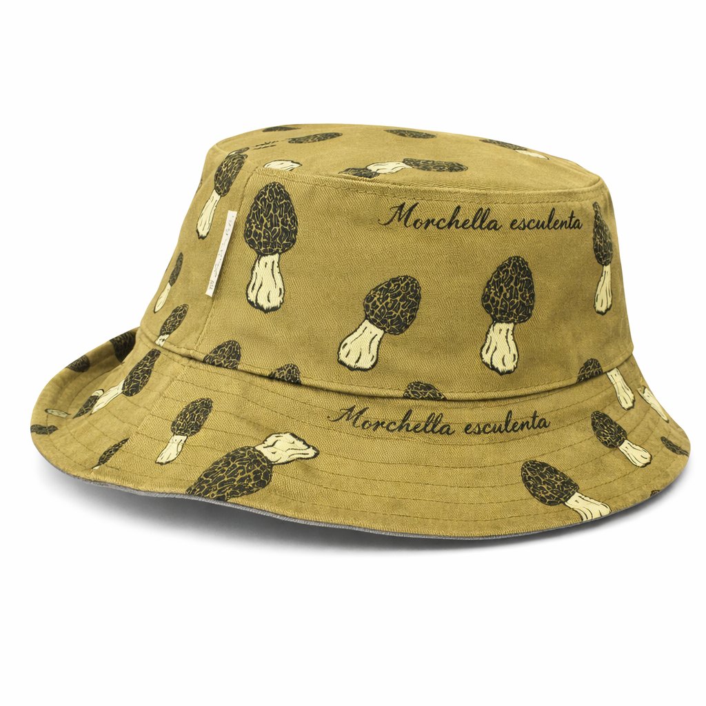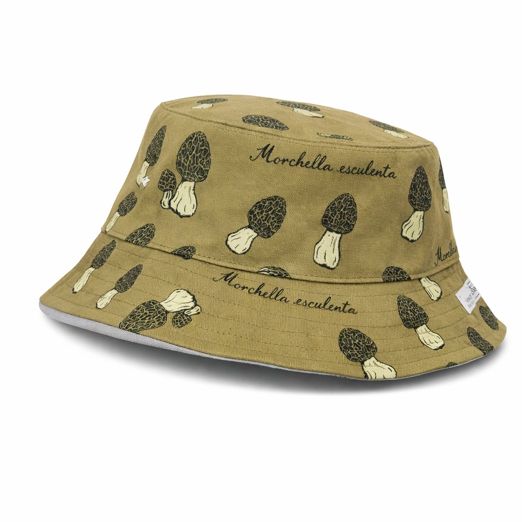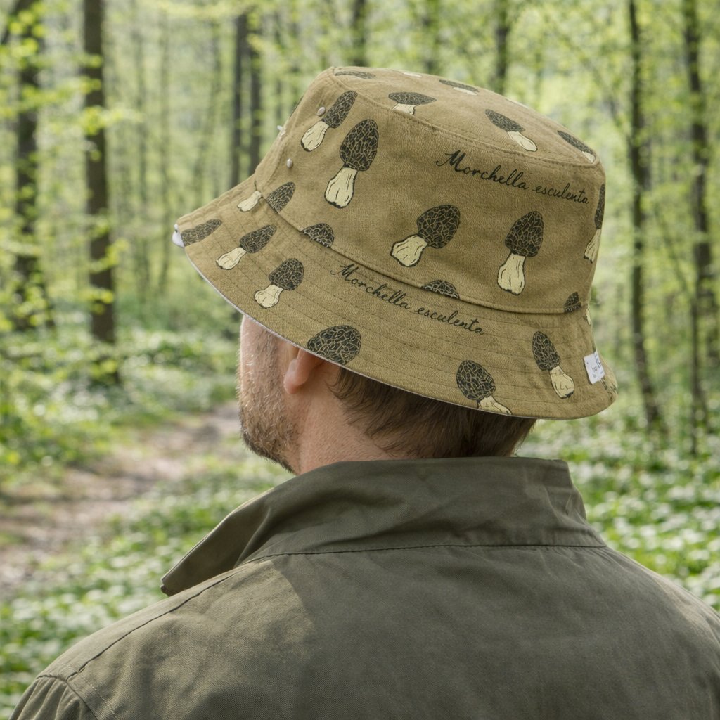 Oboustranný klobouk s motivem smrže obecného. Originální potisk látky z naší dílny zdobí smrži různých velikostí. Na látce naleznete latinský název smrže, který je jednou z nejchutnějších lesních hub. (Morchella esculenta). V tomto klobouku se budete v lese plném houbařů cítit jako king, který má svá místa pod kontrolou:o)
