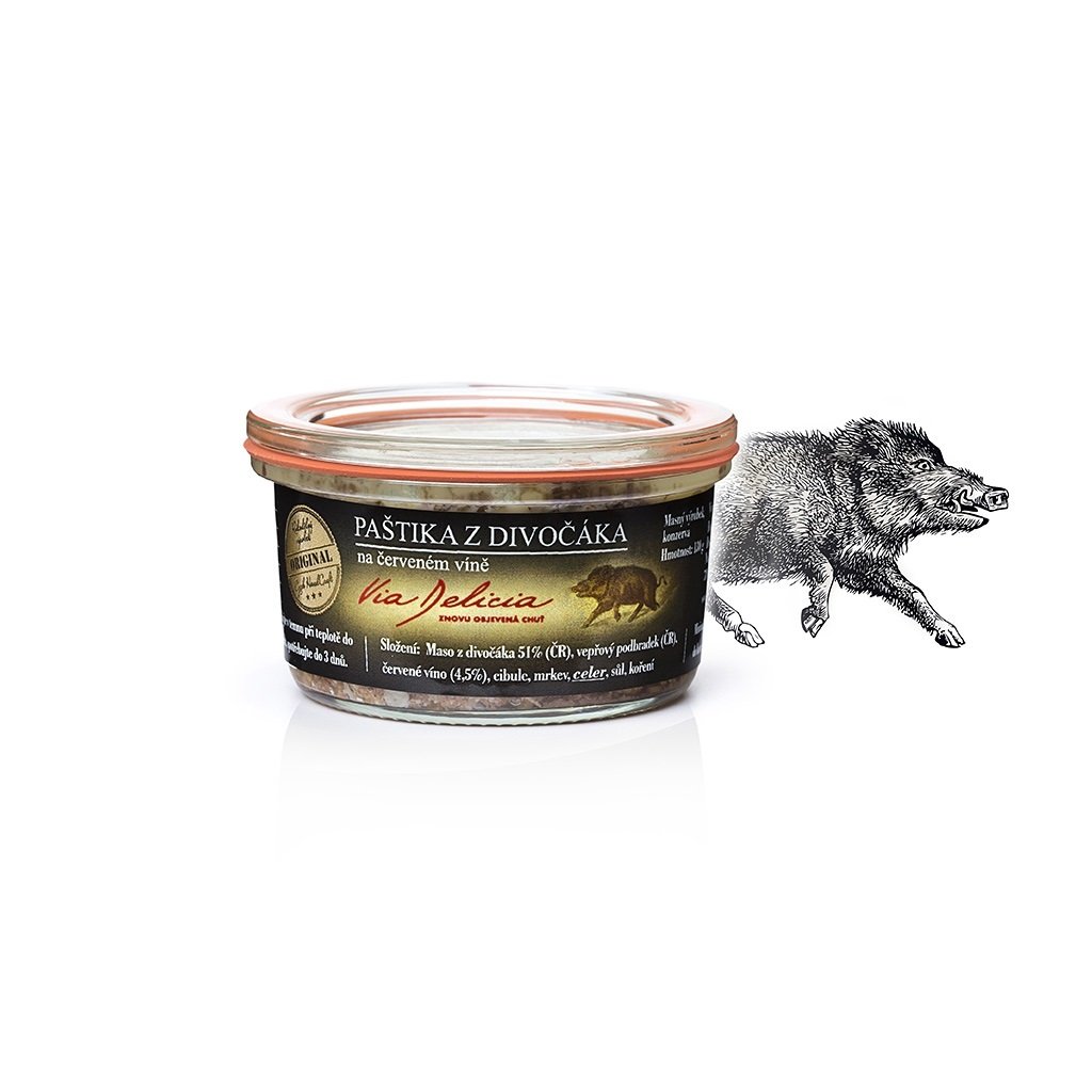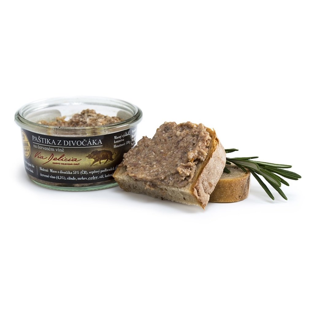 Chuť paštiky formuje maso z divočáka, restovaná kořenová zelenina a směs divokého koření s jalovcem. Vhodné na tmavý chléb nebo na topinku.