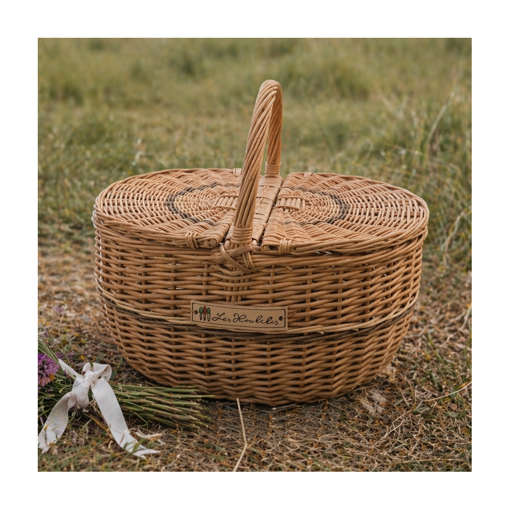 Prostorný piknikový proutěný koš velkorysých rozměrů, do kterého se vejde vybavení na luxusní piknik pro dva - deka, občerstvení, lahev vína i nádobí.