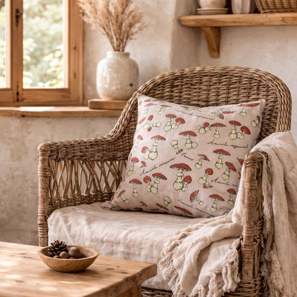 Dekorační povlak na polštář 40×40 cm s jemným lesním motivem muchomůrek ve světle růžové barvě vnese do vašeho interiéru hravou a útulnou atmosféru. Světlý odstín působí něžně a skvěle se hodí do světlých a přírodně laděných interiérů.