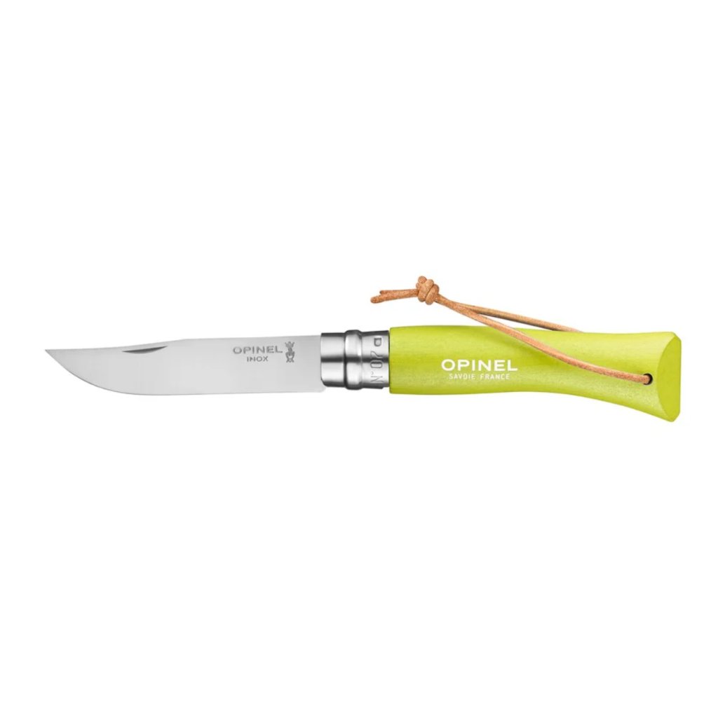 Tradiční zavírací nůž Opinel se světle zelenou rukojetí z habrového dřeva a čepelí z nerezové oceli. Délka čepele je 8 cm.
